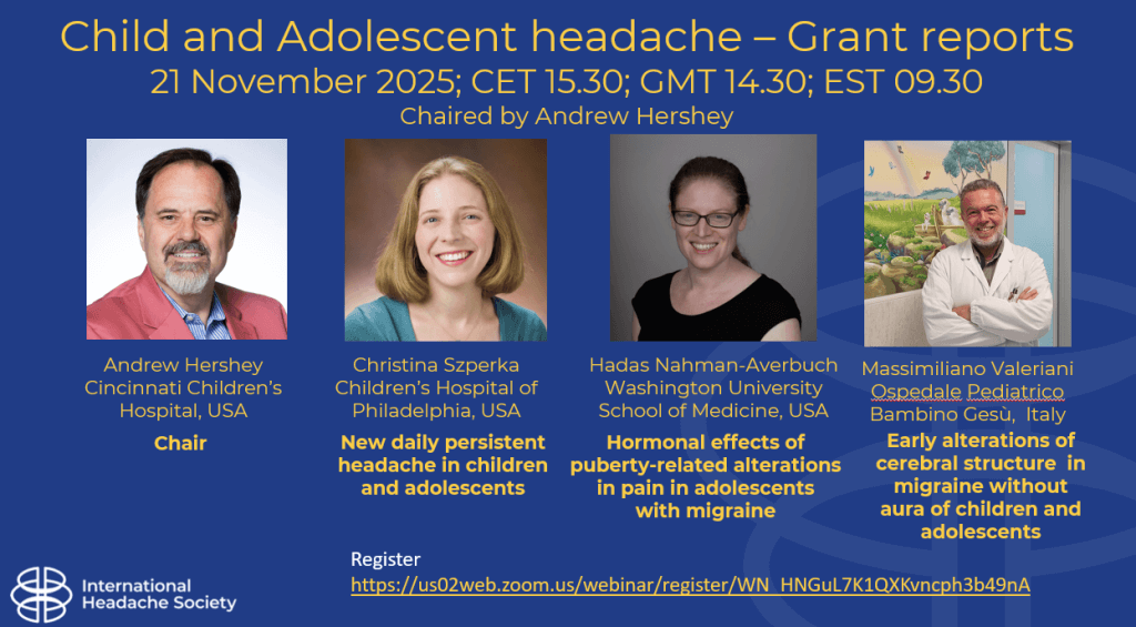 The IHS Child and Adolescent Committee presents the next in its series on headaches in children and adolescents on Friday 21 November at 15.30 CET, 14.30 GMT, 09.30 EST.